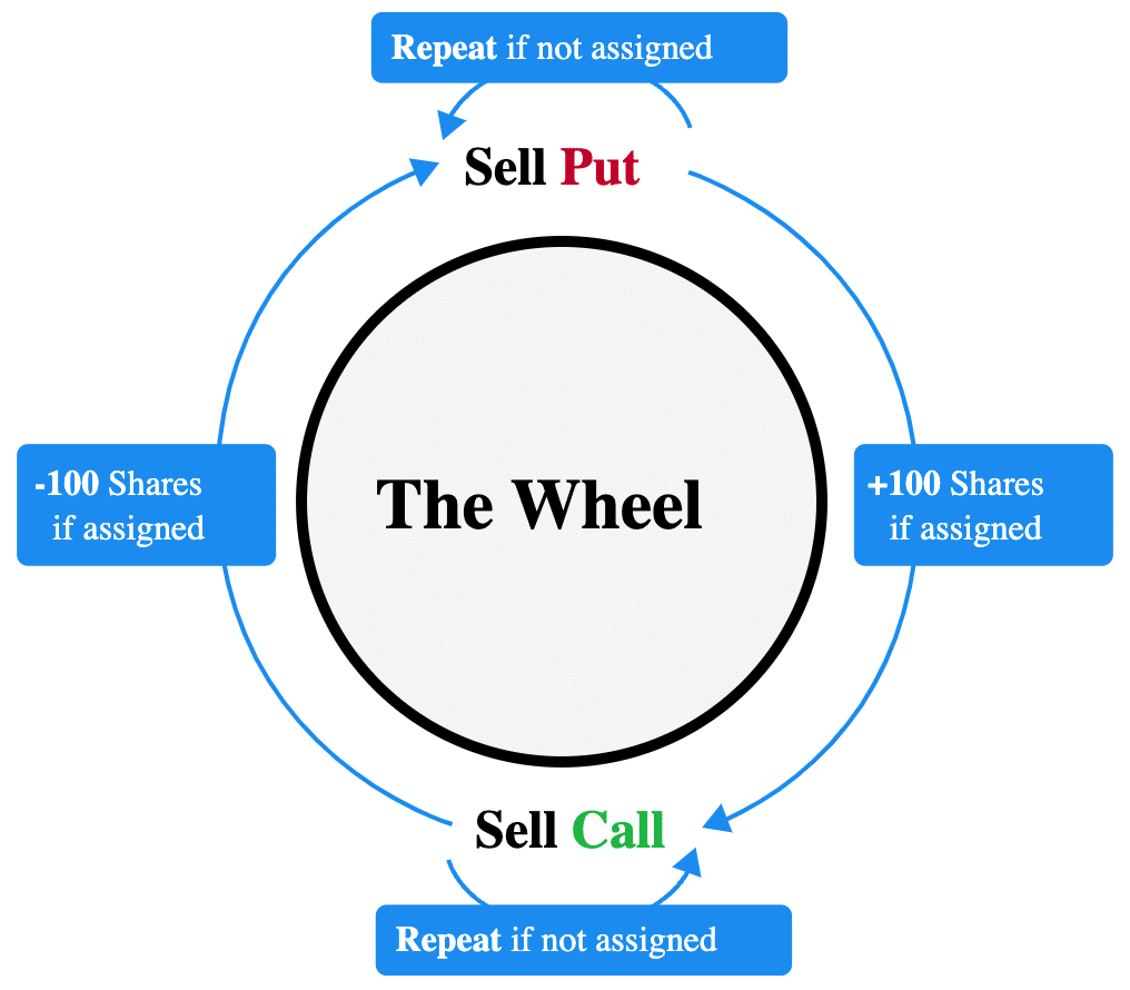 The wheel options strategy is a systematic income-generating approach that involves selling cash-secured puts to acquire stocks at lower prices, potentially, and then selling covered calls on the assigned shares to generate additional income. This cyclical process—selling puts, accepting assignment, selling calls, and repeating—creates a “wheel” of premium collection while building stock positions at favorable prices.